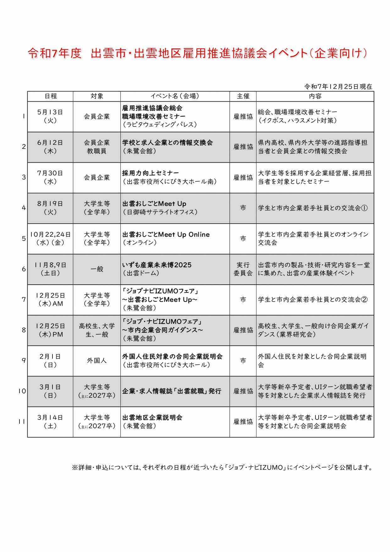 令和7年度 出雲市・出雲地区雇用推進協議会年間イベントスケジュール(企業向け)