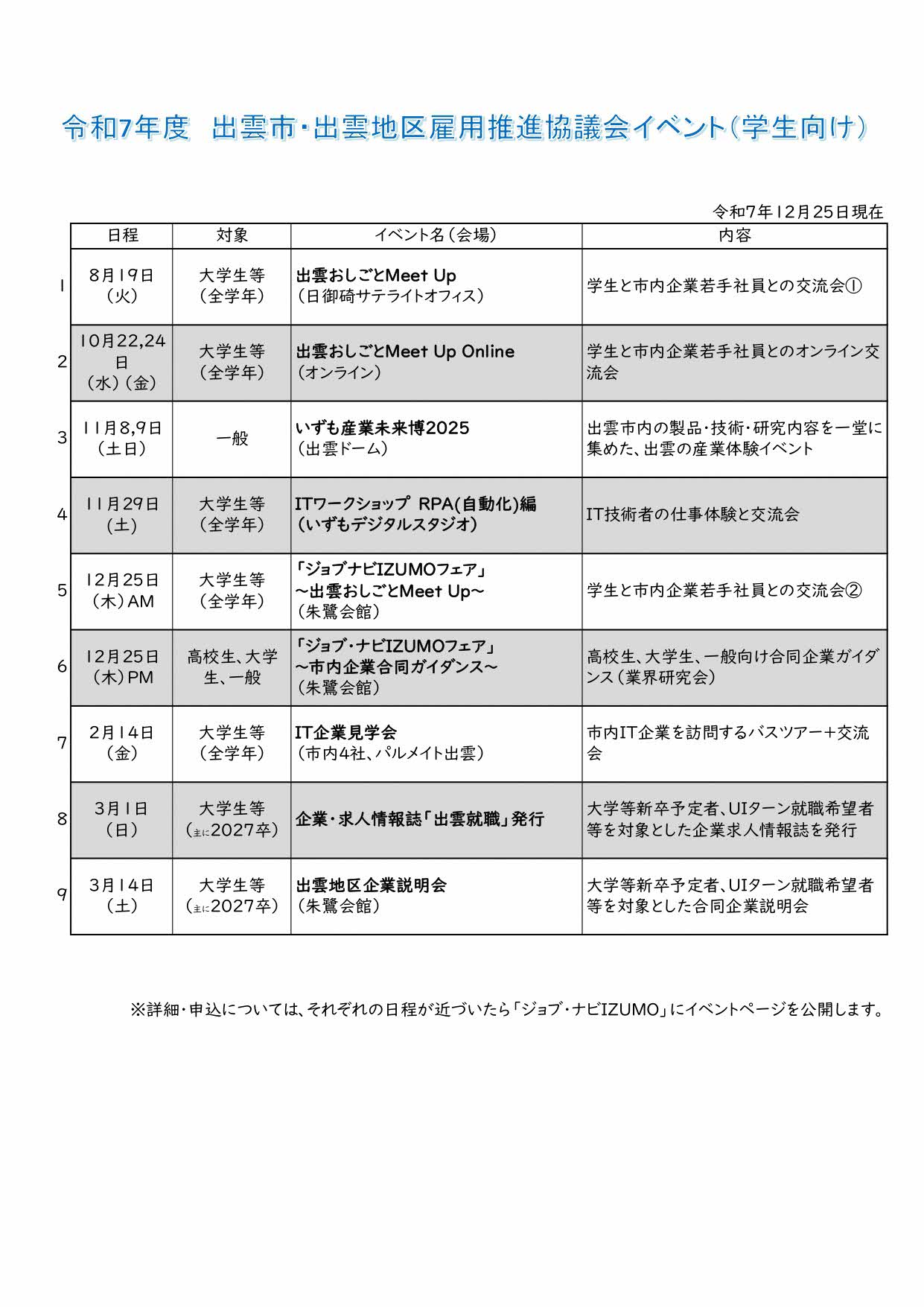 出雲市、ハローワーク出雲、市内企業、経済団体が協力して、若者の雇用・定住対策のため活動しています。