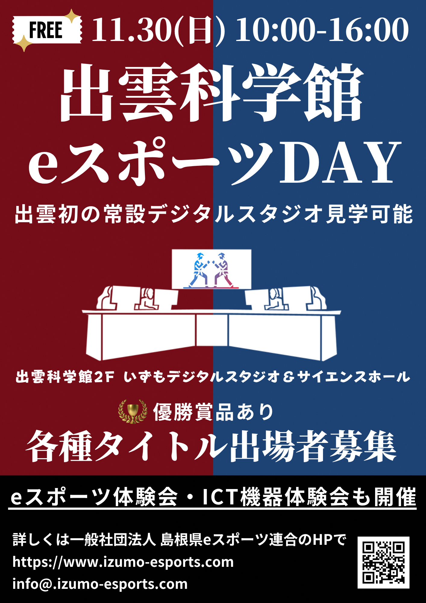 11月30日(日)、いずもデジタルスタジオオープニングイベントとして、「出雲科学館eスポーツDAY」を開催します!